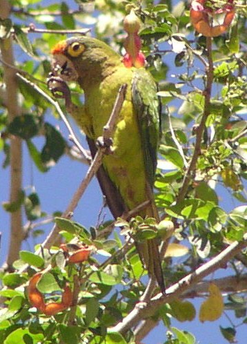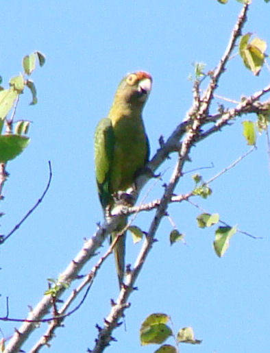 | The Orange-fronted Parakeet is a medium-sized parrot that ranges from western Mexico to Costa Rica. It eats seeds, flowers and fruits. It most often builds its nest in a termite nest. We saw the one at right at Laguna Manialtepec near Puerto Escondido, Oaxaca. |