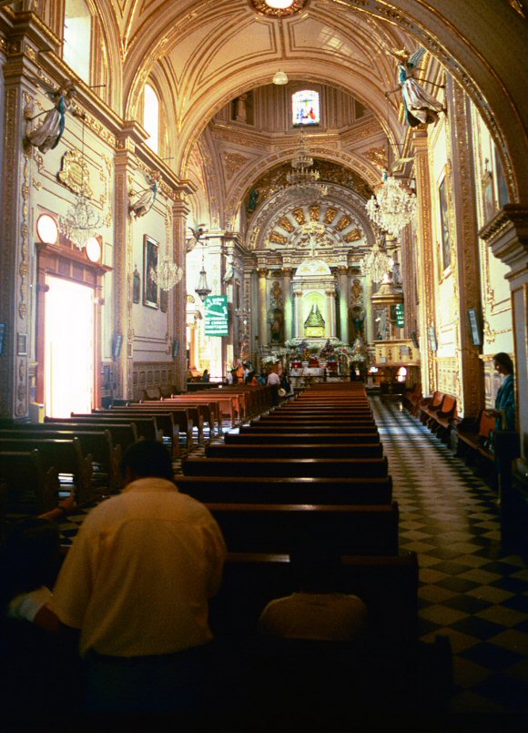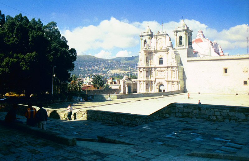 | The Basilica de la Soledad is a large church located on Av. Independencia, 1 block north and 5 blocks west of the NW corner of the zócalo. It was built in 1692 in the baroque style, the holy site of the Soledad virgin, patron saint of Oaxacans. In front of la Soledad is Jardín Sócrates (barely visible under the trees in the photo at left) where there are several stands selling Oaxacan ice cream. In the right foreground is Plaza de la Danza. And somewhere on those hills in the background is the archaeological site Monte Albán. | |