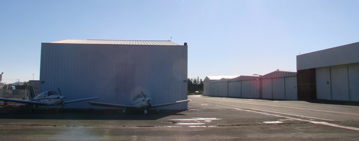 Two Cherokees sit in front of a row of general aviation hangers at León-Guanajuato