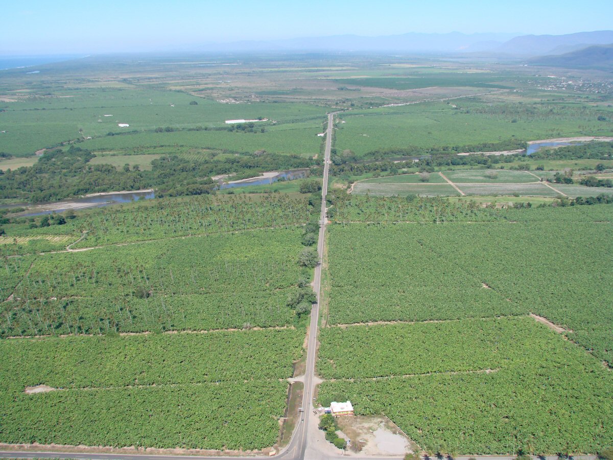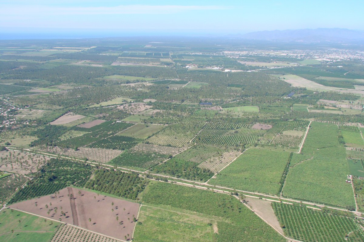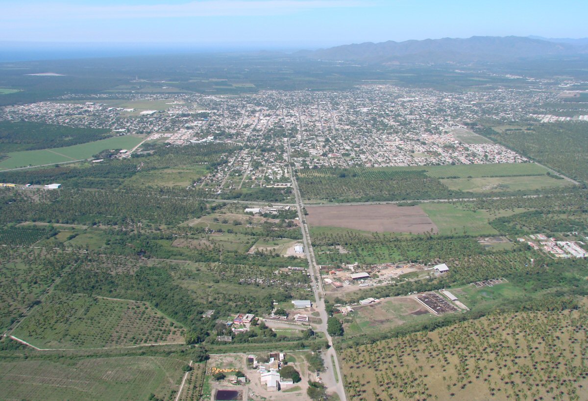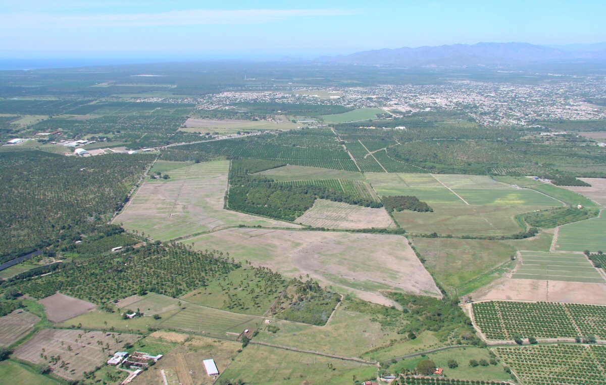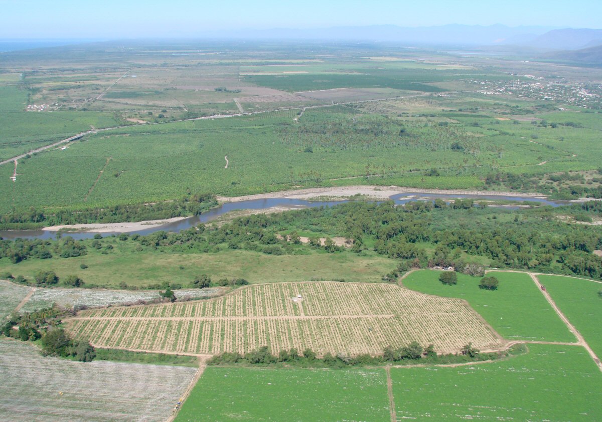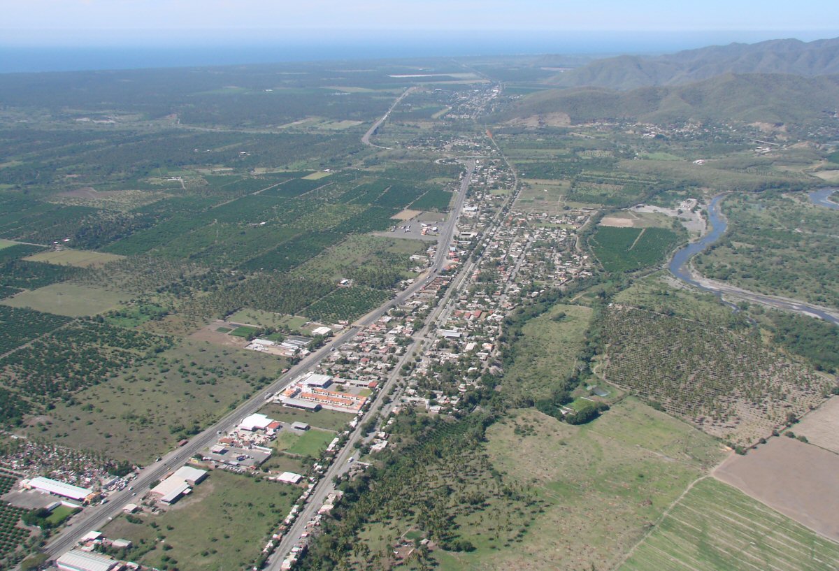 Nuevo Caxitlán in foreground with the towns of Adolfo Ruíz Catinez and Ciudad de Armería in background, Río Armería at right