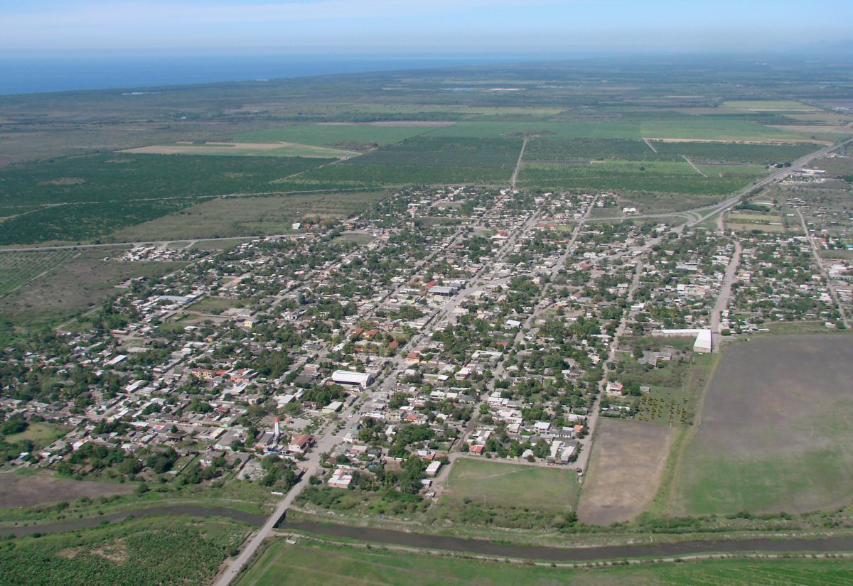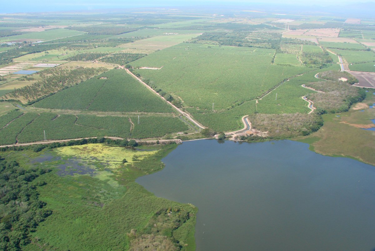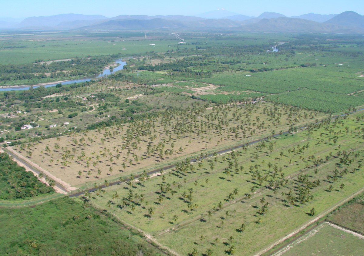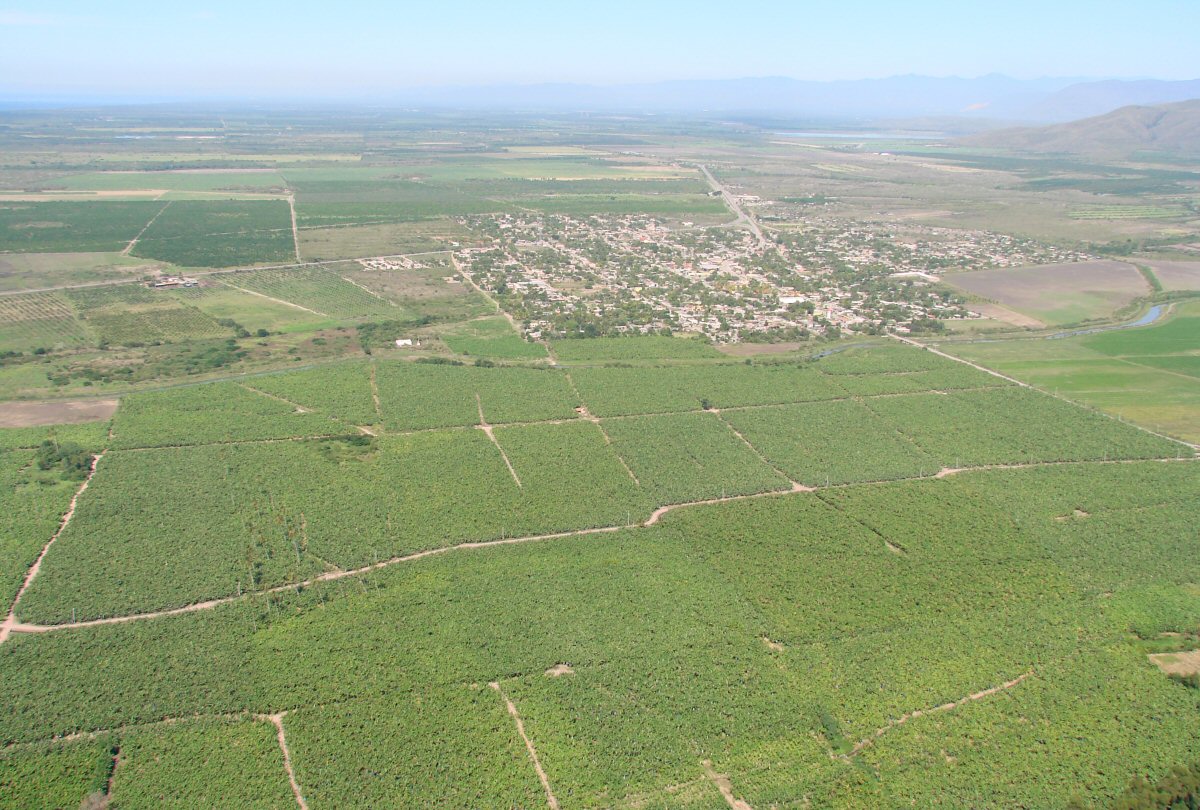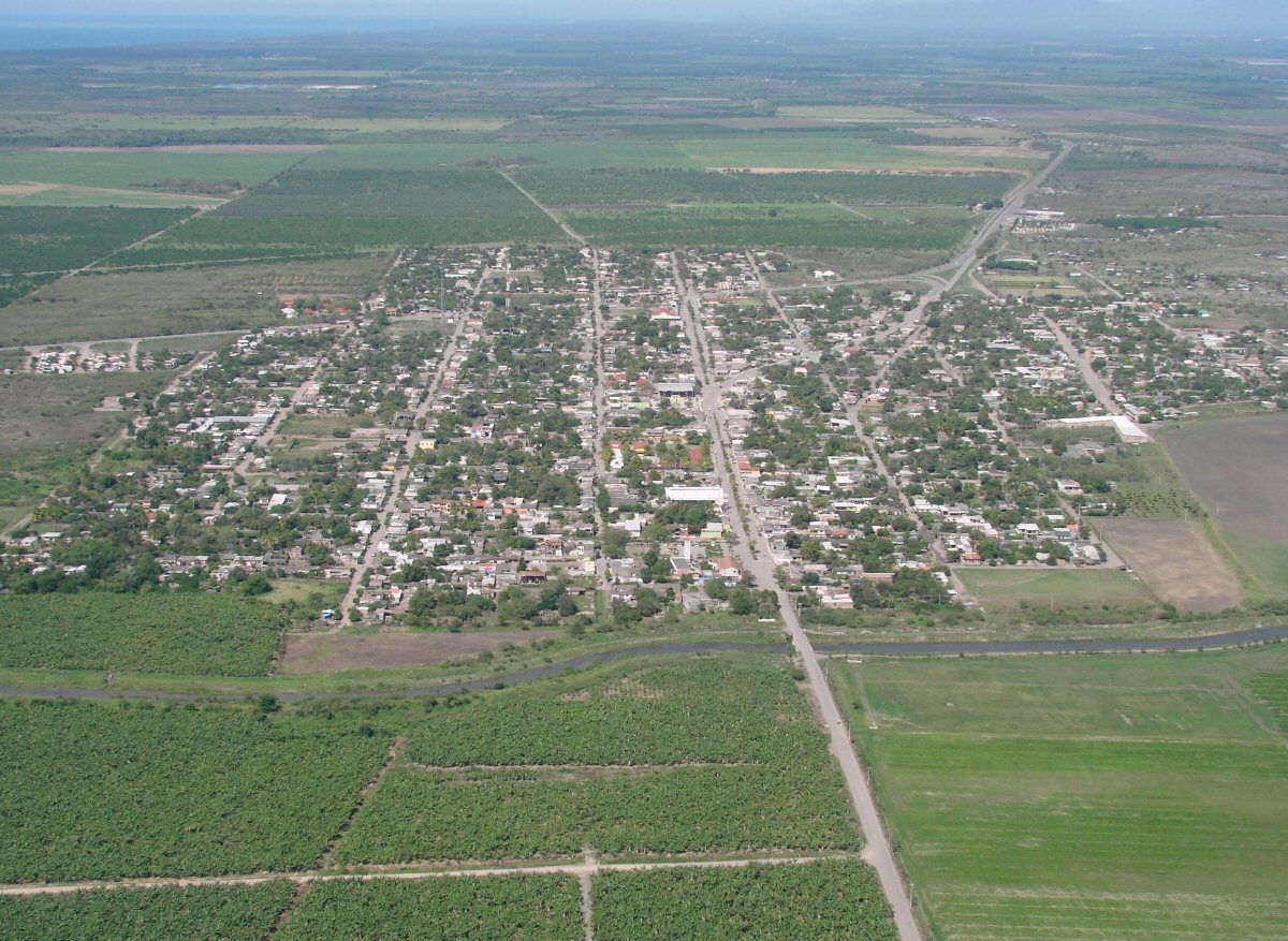 Nuevo Caxitlán in foreground with the towns of Adolfo Ruíz Catinez and Ciudad de Armería in background, Río Armería at right
