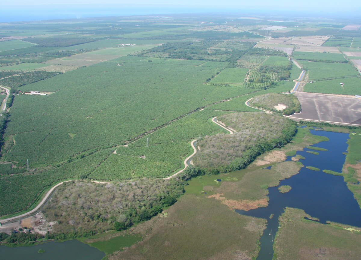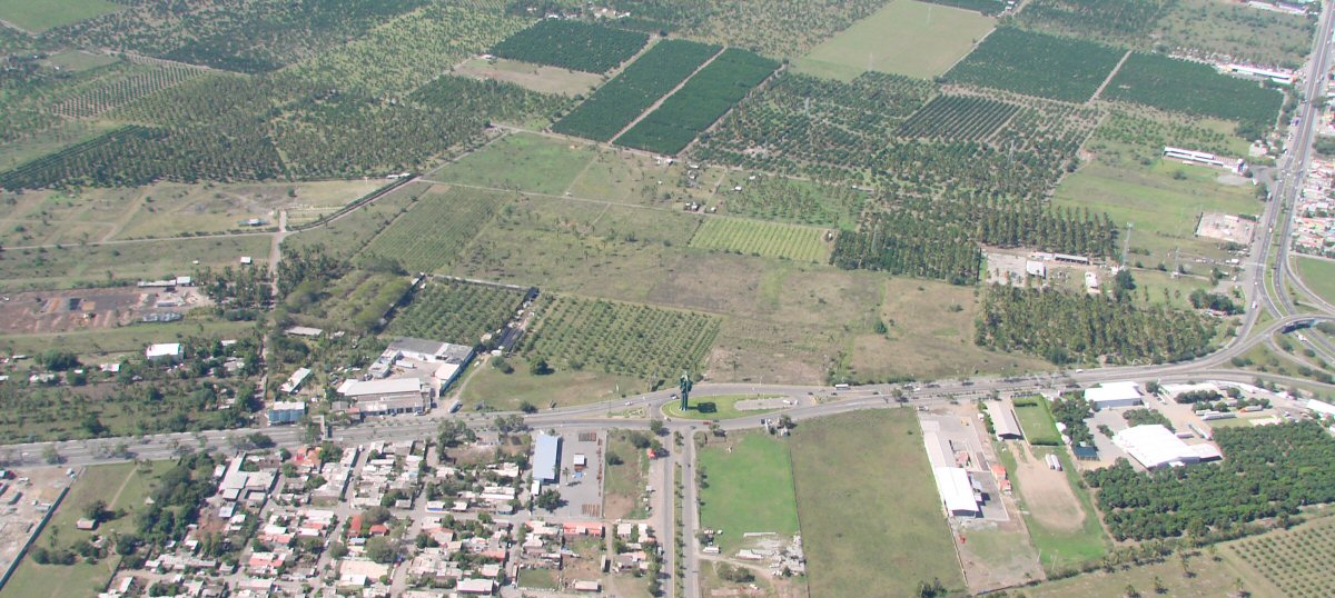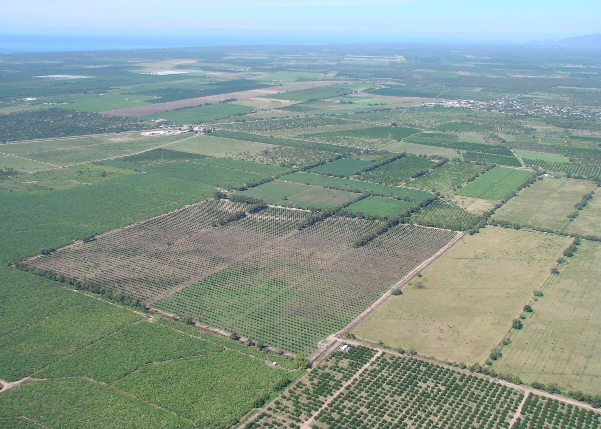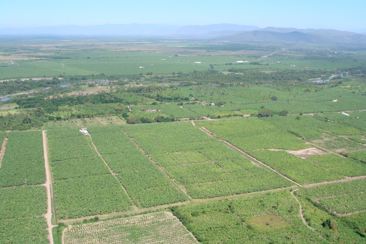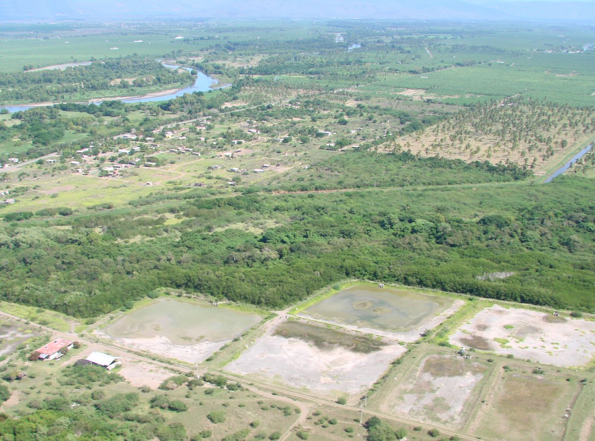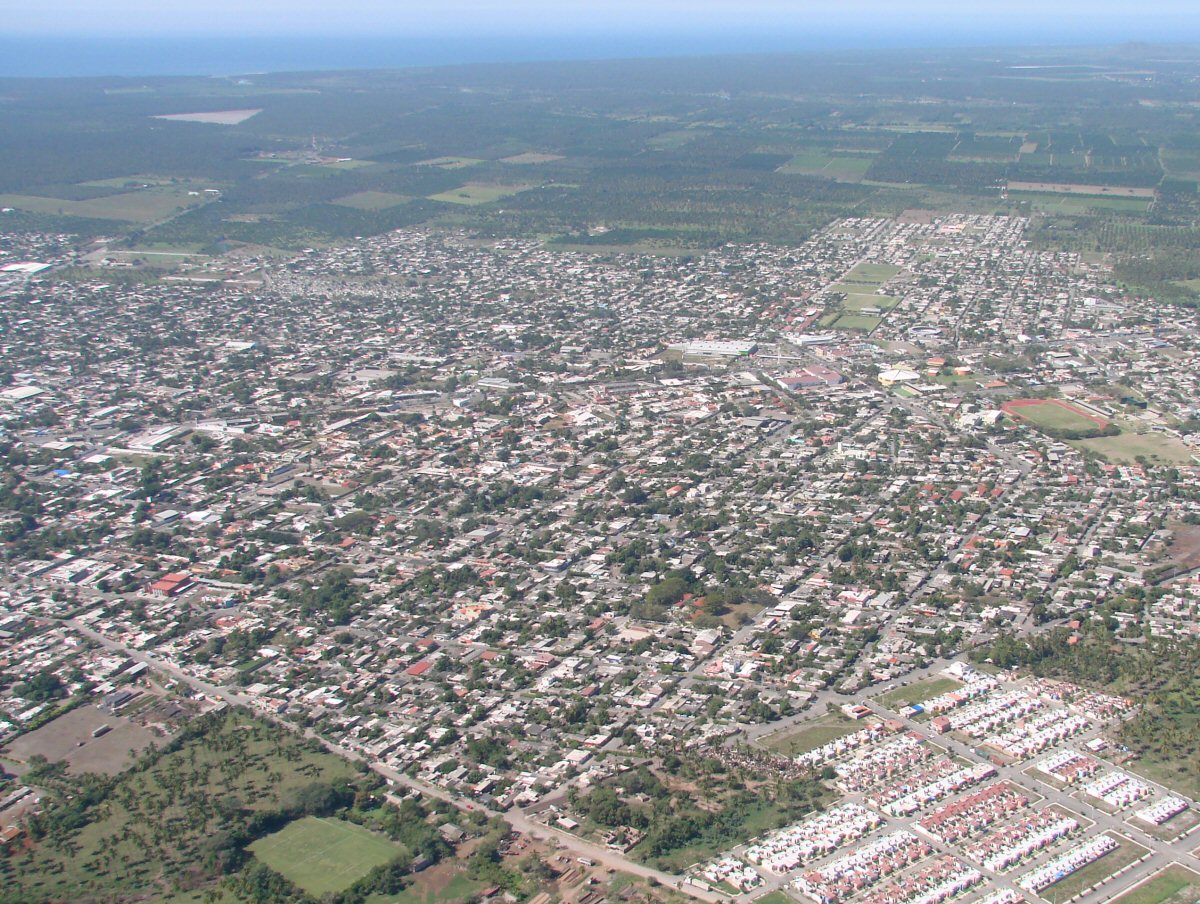 Nuevo Caxitlán in foreground with the towns of Adolfo Ruíz Catinez and Ciudad de Armería in background, Río Armería at right