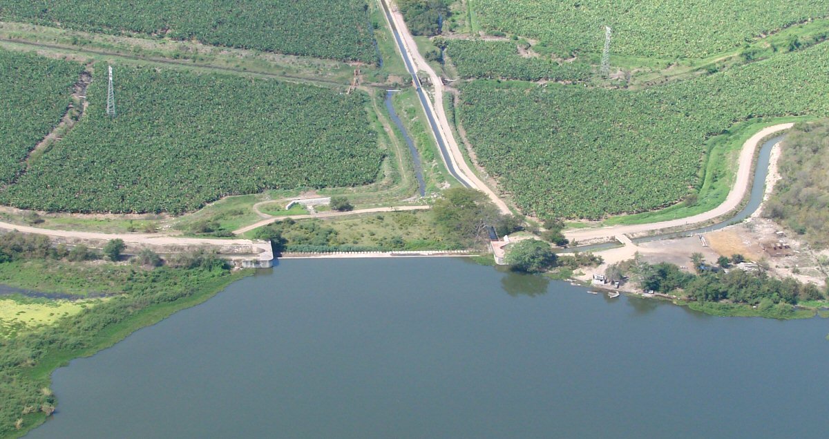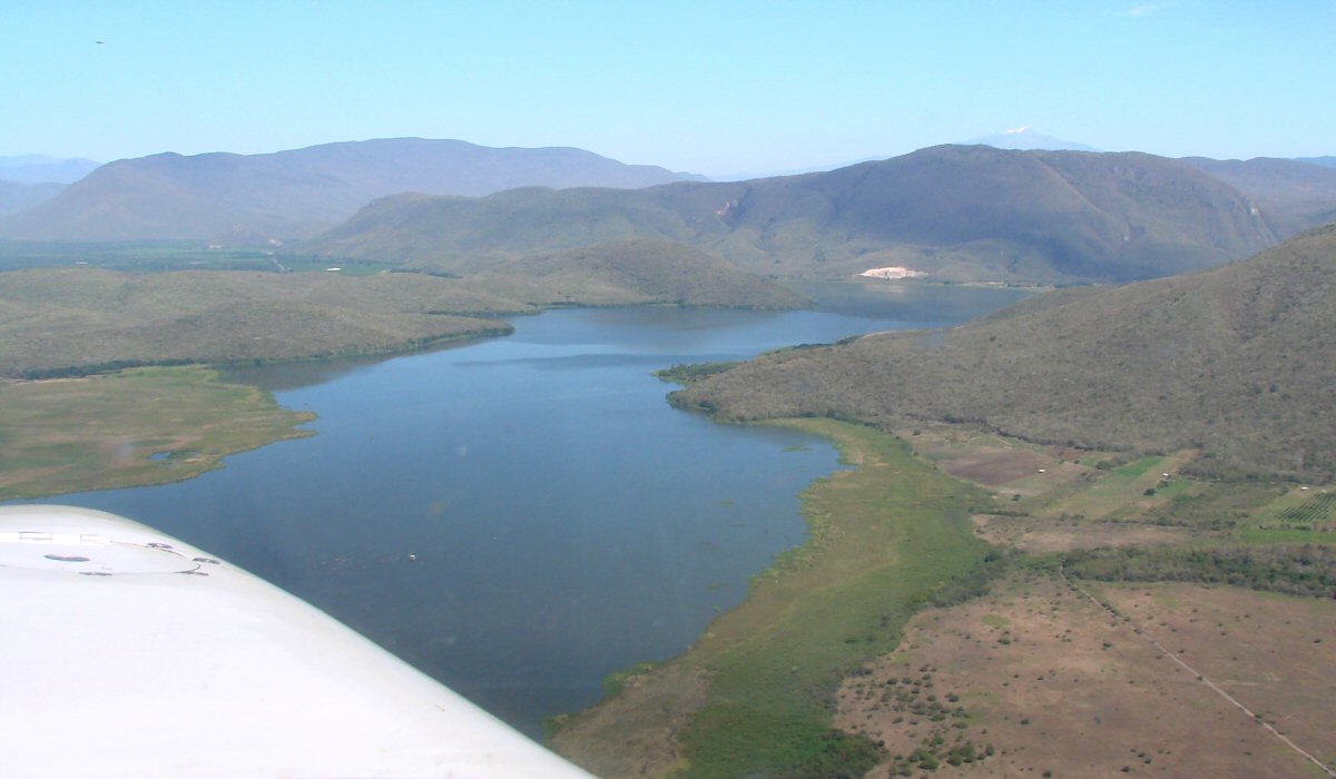 Laguna Amela is the source of irrigation water for the region. The slope of Cerro Cabeza de Toro is visible at right and snow-capped Nevada de Colima is in the background.