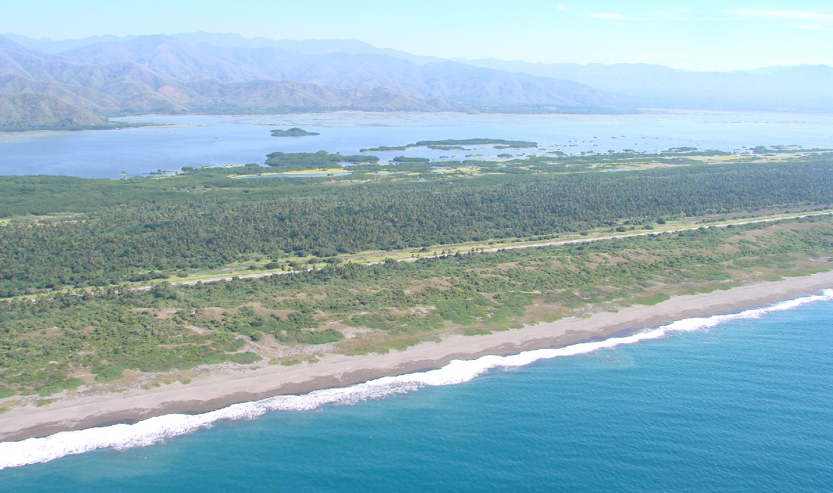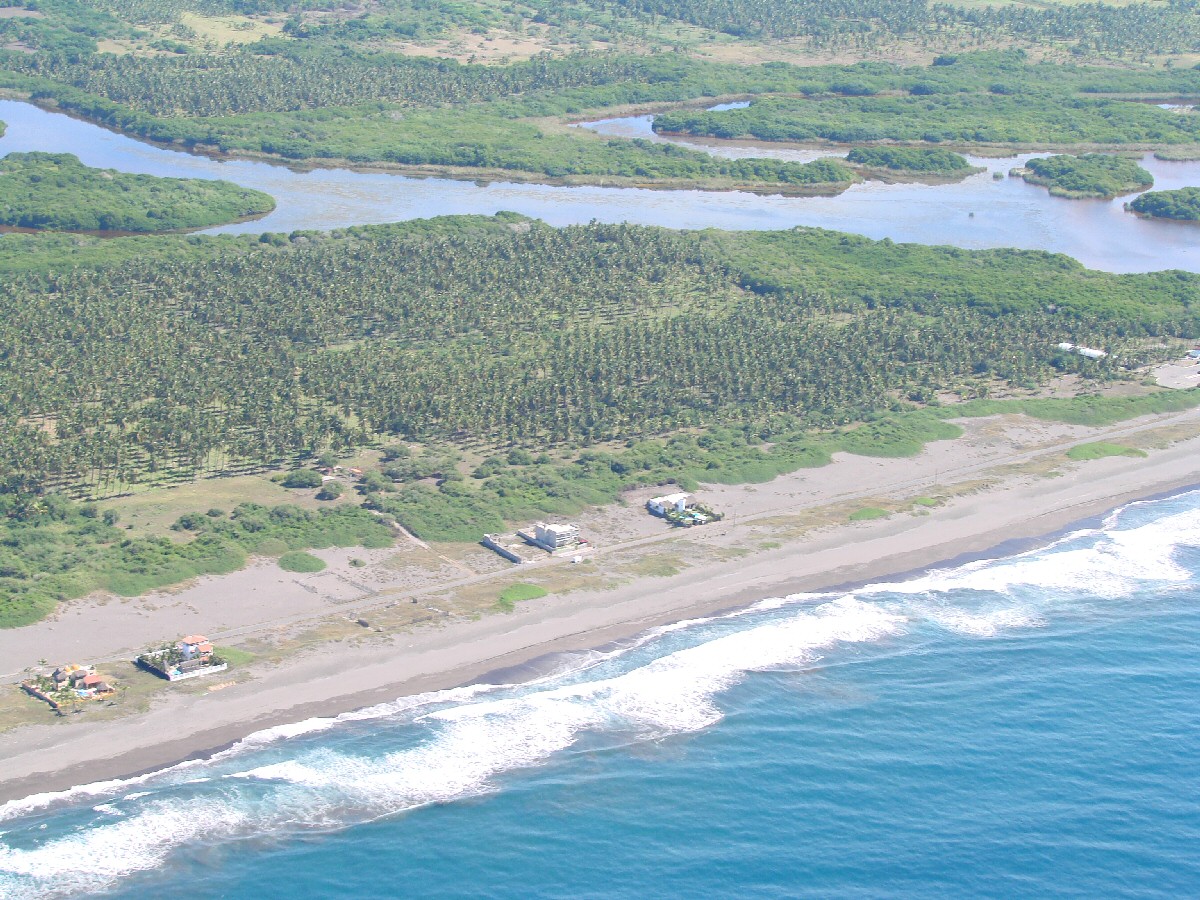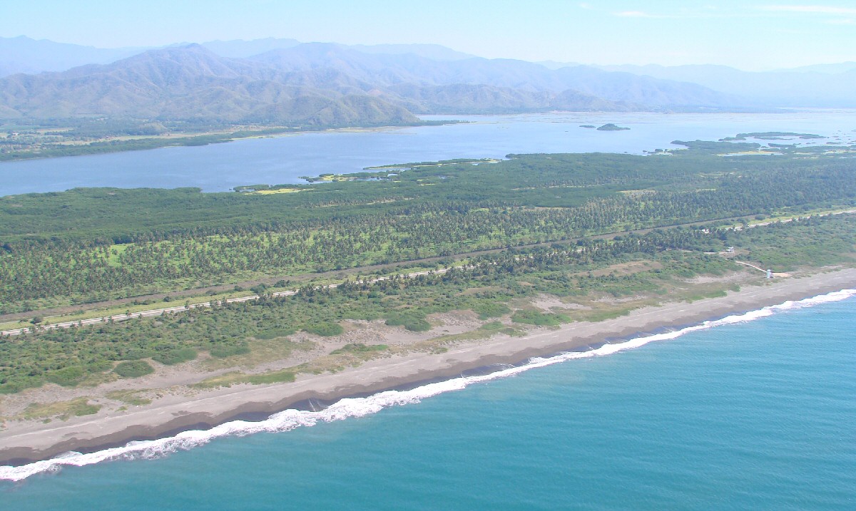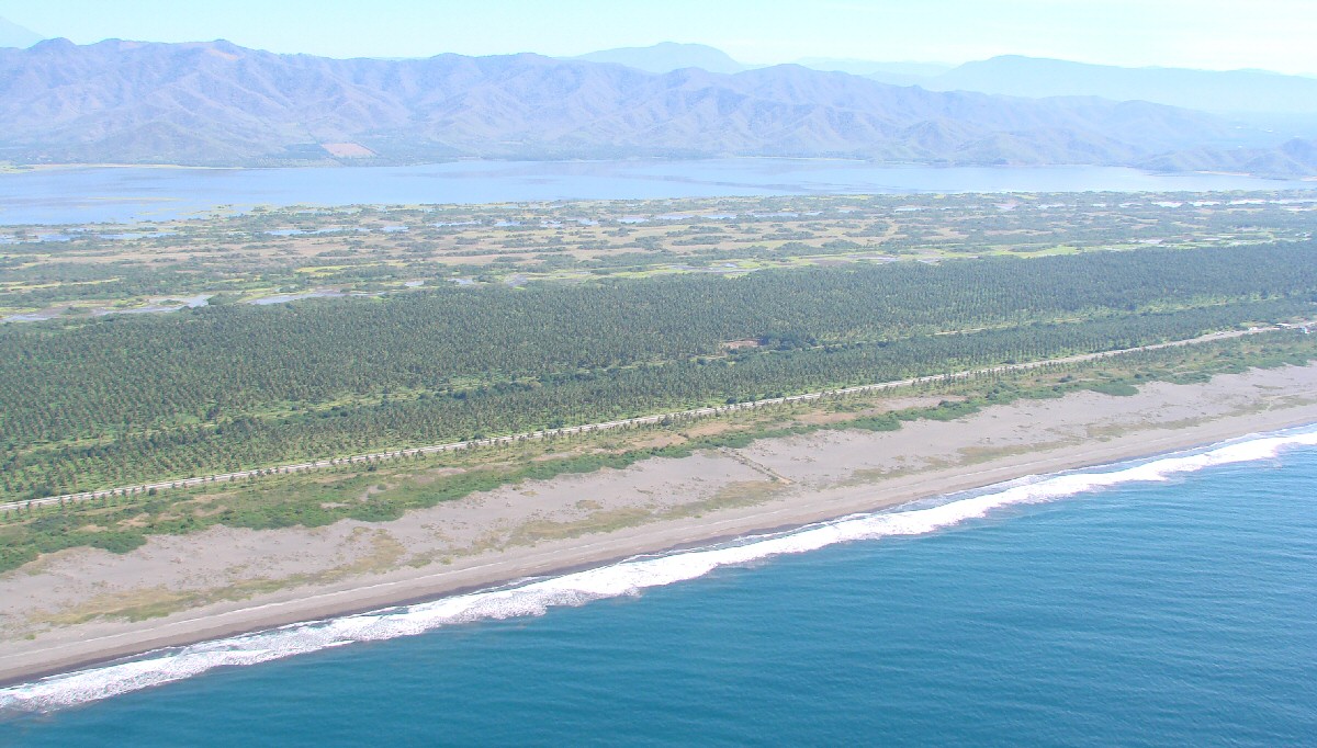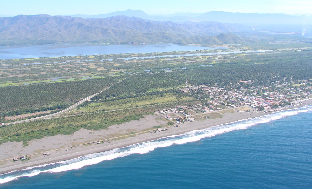 The town of Cuyutlán comes into view. Laguna Cuyutlán in background.