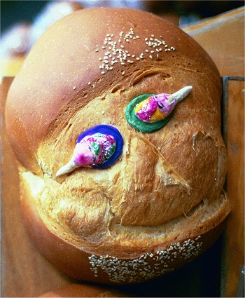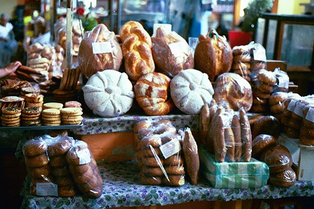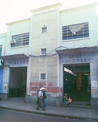 The Mercado 20 de Noviembre occupies the inner spaces of a city block. It is located across the street (Ignacio Aldama) from the Benito Juarez market. There are entrances all around the block. The west entrance is shown at left. Within the market are many stalls selling mainly bread and lunches. |
