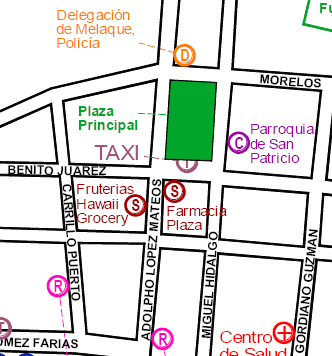 Melaque's Plaza Principal is located just 3 blocks back from the beach and is the business center for this small town. In the photo at left, the Parroquia de San Patricio can be seen in the background. To the right and out of view on the south side you will find a taxi stand, the Farmacia Plaza and Mi Casa Restaurant and Cantina. On the north side is the Delegación de Melaque and the Police Station.