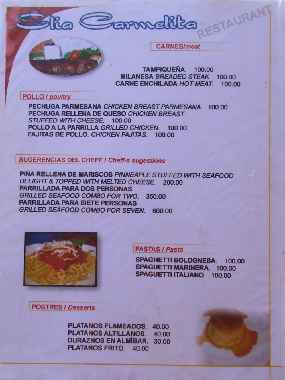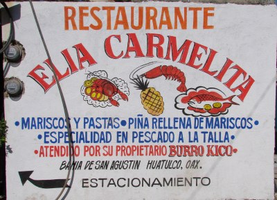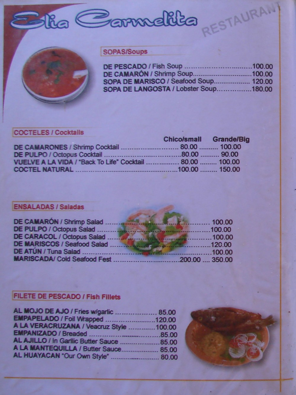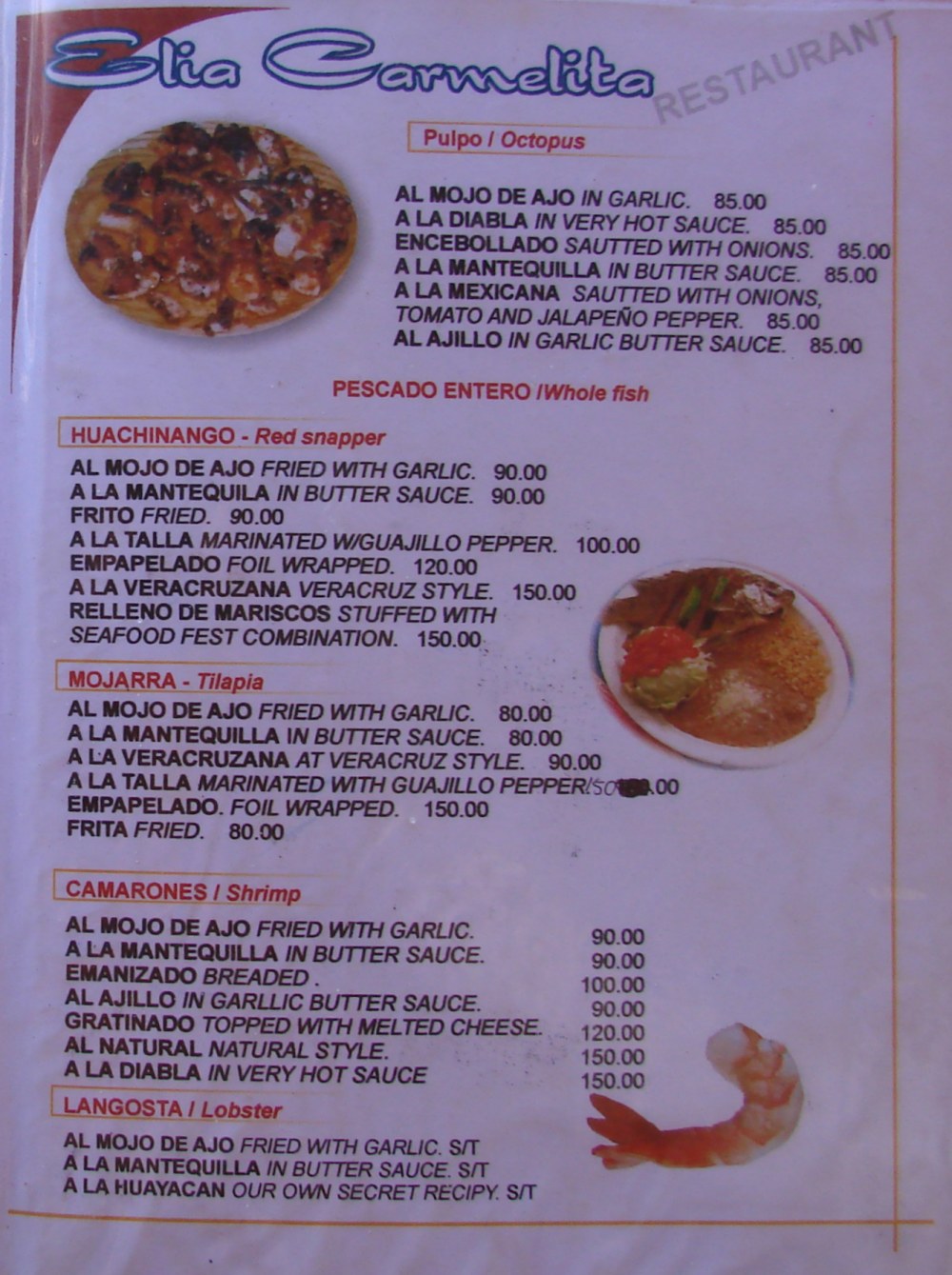 The English translations and the pricing reflect the influence of the nearby Huatulco resort.