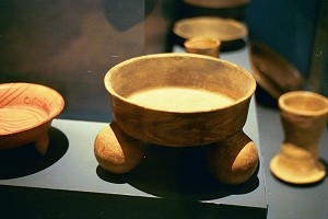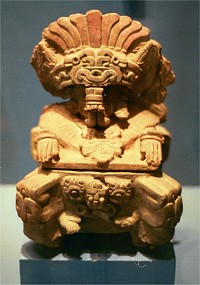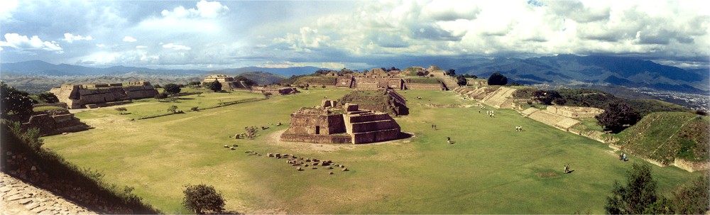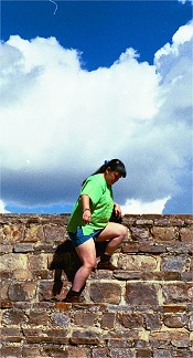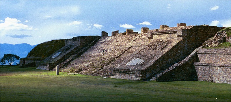 The Olmec/Zapotec center, Monte Albán, sits on a hilltop 400 meters above the valley floor near the city of Oaxaca, Mexico. The site is at the confluence of three large valleys, the Tlacolula Valley to the east, the Etla Valley to the north, and the Zimatlán-Ocotlán Valley to the south, all fertile agricultural regions. Monte Albán began to emerge as a regional center sometime around 500 B.C. It's function seems to have been to unite the people of the three valley regions. The early architecture shows Olmec influence. According to our guide, the Zapotec later took control and rebuilt the center in their own style by building over (encasing) the original structures. As seen in the photo at left, the steep steps typical of pre-Columbian sites are not made for ease of climbing. The different levels are symbolic of the levels of deity and authority and were scaled by the priests or rulers. |