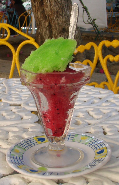 Ice cream or nieves is very popular here and there are many flavors to choose from. Oaxaca's tropical location and mountainous terrain yield a variety of growing climates leading to a diverse supply of locally-grown produce. So the flavors are natural and numerous but artificial coloring is used. Many of the ice cream flavors that are common here are unheard of elsewhere. The Oaxacan ice cream is not "creamy" but has a coarser texture containing ice crystals. This can be overlooked because it tastes so good.