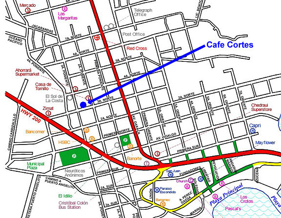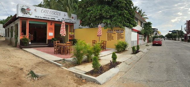 Café Cortes is a coffee shop and cafe located at 3A Norte between 2A Poniente and 3A Poniente. They sell shade-grown certified organic coffee in light, medium, and dark roast. Roasted in Chila. Whole beans or ground to your specification. Also serving breakfast and lunch. Friday through Sunday they have an all you can eat buffet for $55 pesos. Café Cortes supplies coffee to the La Casita coffee store.