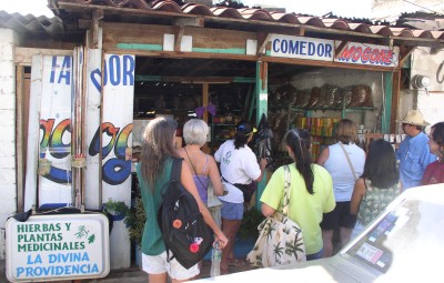 Monday, November 27: Monday morning we had an 8:30 breakfast with owner, Paul Cleaver, at El Tabachin, a hotel/restaurant behind the Hotel Sante Fé noted for its breakfasts. In additional to regular breakfasts, the Tabuchin offers some vegetarian versions, some rather elaborate. For example Desayuno 11 is juice, fruit, vegetables with tofu and almonds, broccoli, chinese peas, asparragus, jicama, soy sprouts, onions, sweet peppers, carrots, etc. and coffee or tea. We went for a more basic breakfast with bacon, papas fritas, huevos rancheros in the Tabuchin style (with a tortilla lid). I especially liked the bacon, which was thick, crisp, and not very fatty. Some of the food served hear comes from their own farm and they even make their own brown sugar. We were impressed with the renovation work being done on the hotel with some very decorative tile work.