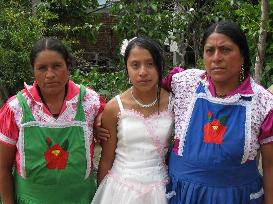 Gloria, María and Luci are 40, 38 and 12 years old respectively. While in the market, their traditional dress, consisting of brightly colored and embroidered taffeta dresses and head-dresses, easily sets them and others from nearby villages apart from the rest. Luci confesses that she also likes wearing regular clothing.