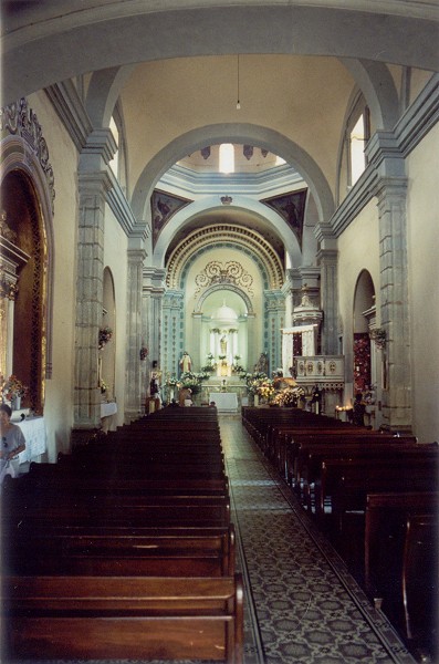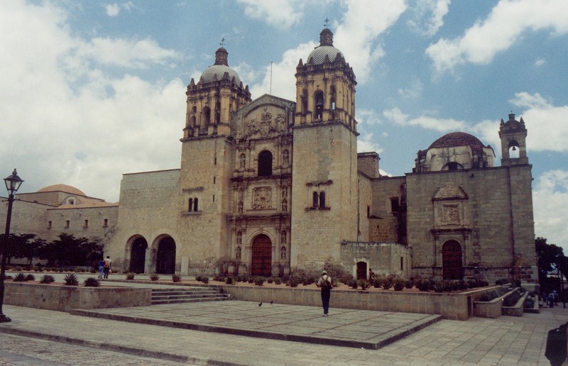 The Dominican church was established in Oaxaca in the 1570s. The early structures repeated sustained earthquake damage. The present day church building was completed in the mid 1600s. The massive walls have allowed this building to surface numerous earthquakes. This type of construction is reminiscent of other surviving churches in the city of Oaxaca. The interior is richly decorated with densely ornate artwork. The photo at left, I believe, is the interior of a building next to the Santo Domingo. Also located in the 4-block complex is the museum Santo Domingo Centro Cultural.