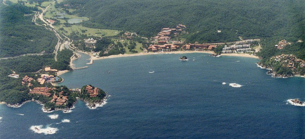 The sprawling complex in the left foreground is the Club Med, their largest facility. The domed buildings perched on a hilltop at left center is the Quinta Real Hotel. Behind the Quinta Real, the golf course can be seen winding its way down the valley to the beach. On the beach in the center of the photo is the Barcelo.
