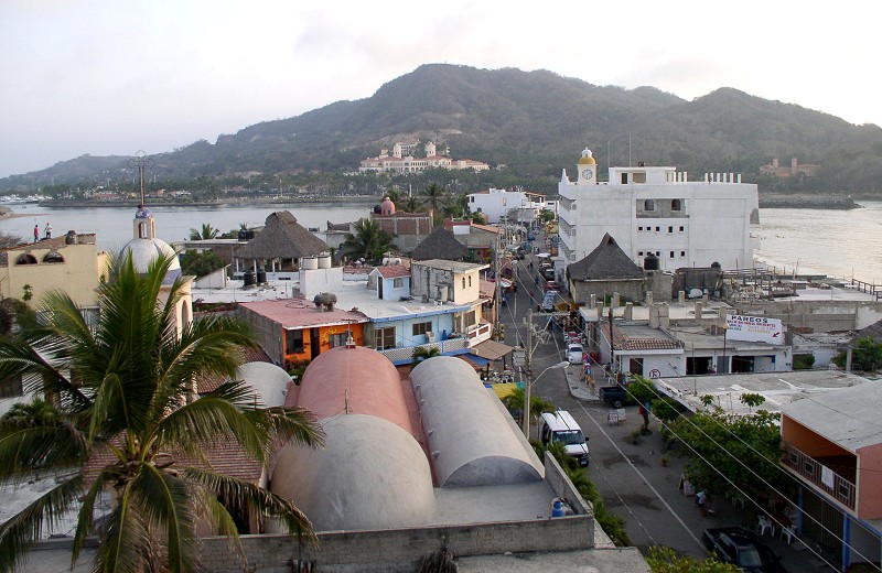 View along the Barra de Navidad peninsula and across the lagoon to Isla Navidad, also a peninsula (clickable image)