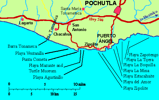 Additional accommodations are available in Zipolite to the east and Mazunte 1 km to the west.