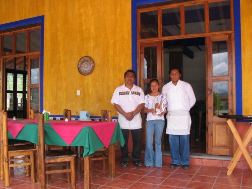 The operation has recently expanded into two distinct parts with the gallery, kitchen and washrooms housed in one building and the restaurant in another. Regarding the former, owners Jacobo and Maria Ángeles have gathered the works of about 15 of the best quality artisans in the region. Together with their own pieces, the gallery’s walls and ceiling are filled with splashes of striking color in glass, pottery and wooden masterpieces. Usually a family member is present, painting a fanciful wooden figure with the most intricate of predominantly Zapotec designs. Ask the significance of each symbol and the process by which the paints are made from all natural, primarily vegetable products.