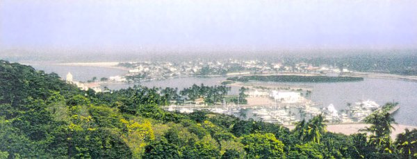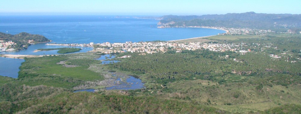 ![]() Barra de Navidad in the background with the Hotel Grand Bay marina in the foreground, Laguna de Navidad at right, and Bahía de Navidad at left. |