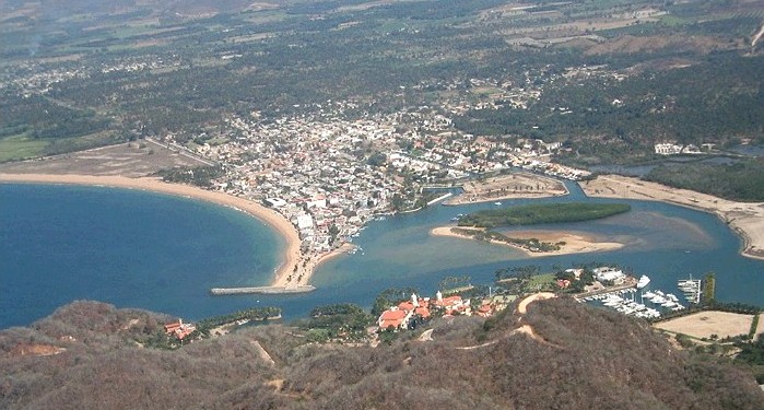 Laguna de Navidad is at right with Isla de Puercos in the center of it. Pigs used to be kept on Isla de Puercos and the fishermen would give any lobster they found in their nets to the pigs because they weren't thought to be good for eating. To the left is Bahía de Navidad. Barra de Navidad is in the center of the photo and the Grand Bay Hotel is in the foreground with its marina at lower right.