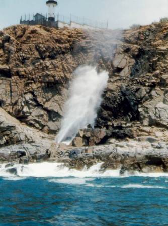 Lighthouse and blowhole at Huatulco, located at the mouth of Bahía Chahue between Playa La Entrega and Playa Organo. A shipwreck just offshore makes an interesting dive site.
