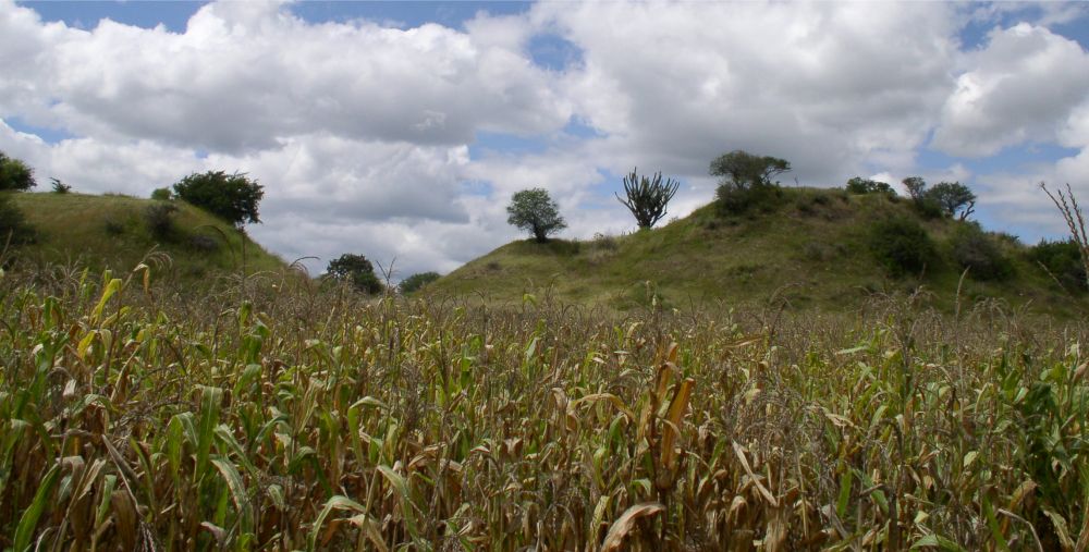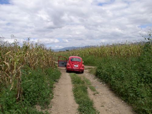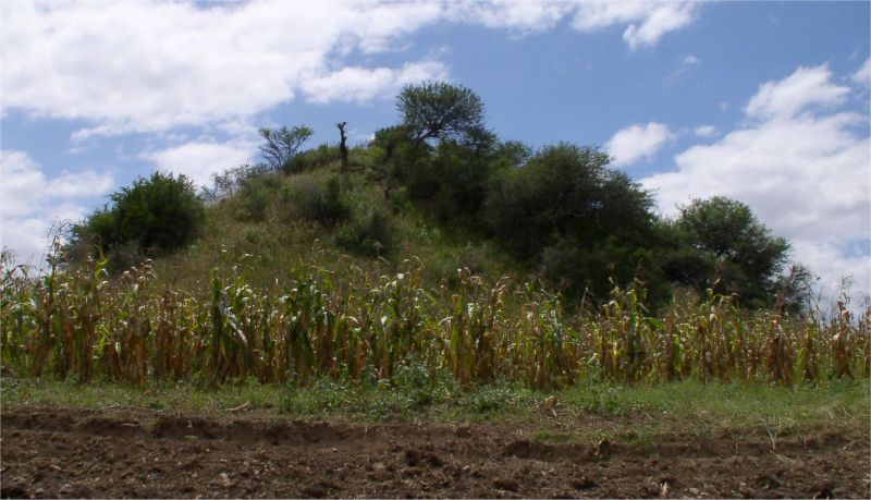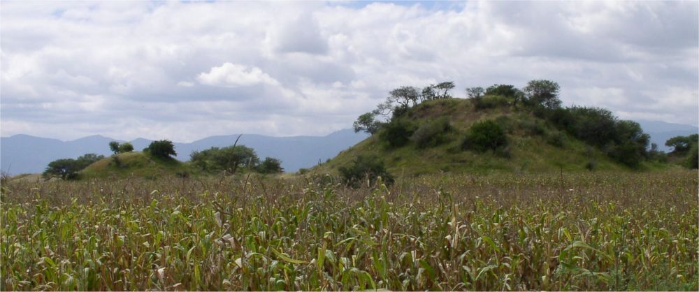El Cerrito is an archaeological site located on the southeast side of Santa Inés Yatzeche. Yatzeche may be reached by traveling west from Ocotlan. This road is not shown on the Guia Roji road map and the road to Yatzeche that is shown is merely a trail through fields of corn and flowers. The site is not open to the public and rises out of a cornfield. One of the piramids was even plowed over and planted in corn.