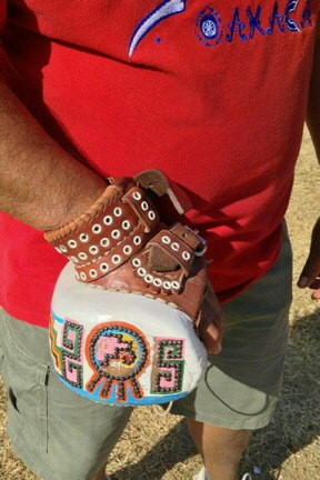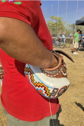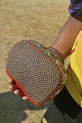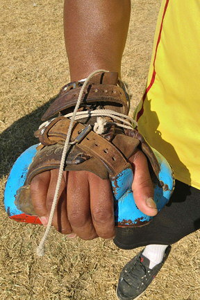 The ball is ~13 cm in diameter, and weighs ~915 grams, or .915 kg, or about 2 pounds. It's heavy! The gloves are all hand-made by craftsmen, or by the players themselves. They weigh 3-6 kg, or 7-12 pounds. (I weighed the balls and 3 of the gloves on an accurate scale myself in February, because I wanted to be accurate.) Imagine swinging a 7-12 lb. glove at a 2 lb. ball flying at you, all day. There was an international competition in February in Chila, that I was lucky to see and photograph. There were 20+ teams from all over Mexico, and 6 teams from California.