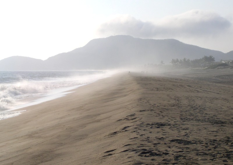 Playa de Cocos is a 14-mile long beach directly facing the Pacific Ocean. It is located on the south side of Isla Navidad, which is not really an island but a peninsula. The beach is actually in the state of Colima while the rest of the peninsula is in Jalisco. The beach is accessed by the Isla de Navidad road which intersects highway 200. Waves are strong and the beach is fairly steep, making the beach unsafe for swimming.