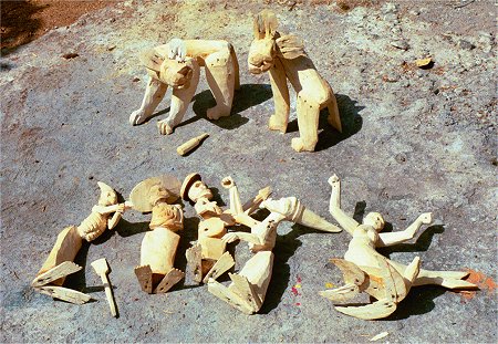 is soft when green and is the wood used to produce the Alebrijes, whimsical wood carvings. The wood is carved when it is still green to take advantage of its softness. After carving, the pieces are placed in the sun to dry as in the photo at right. After drying, the wood becomes hard but also cracks. The cracks are filled in and then the pieces are painted in bright colors. See also San Martin Tilcajete, the village where many of the artisans work. | |