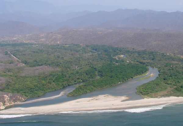 The first Huatulco surfing and boogie board competition was held at Copalita beach on May 1, 2003. The Río Copalita empties into the Pacific 4 miles northeast of the Tangolunda area. The lagoon or bocana can be seen in the middle of the sand. The green areas on the "wet" part, are little islands. The paved road with palm trees along the sides, is the access to the restaurants and parking area. The picture was taken from the mirador (scenic overlook). During the rainy season (May to October) outfitters conduct rafting trips down the Copalita. La Bocana changed a lot with hurricane Pauline. The beach used to be narrower. The beach grew about 300 yards into the ocean because the river brought tons of sand. The surfing area, not shown in the picture, is the part of the beach used by local surfers. It is located on the right side of the beach, 100 yards from the restaurants. Archaeological Site: La Zona Arqueológica Bocana del Río Copalita opened to the public October 2010 after 12 years of excavation and study. The site dates to about 500 B.C. and is located at the boundary between Mixtec and Zapotec regions. A ball court measuring 23 x 45 meters is similar in construction to the one at Monte Albán and contains carvings depicting players. Several other structures have also been excavated. The 35-hectare site is located 10 kilometers from Huatulco. See more Aerial Photos