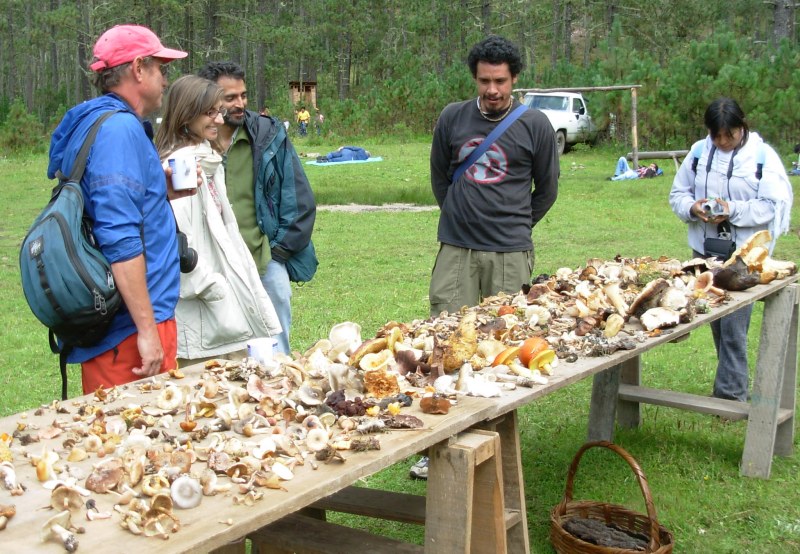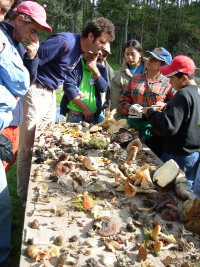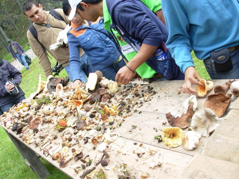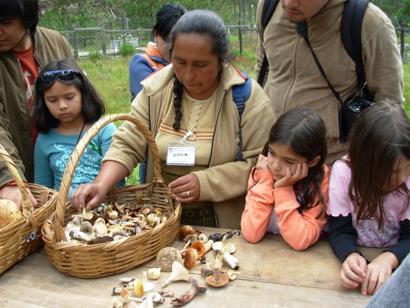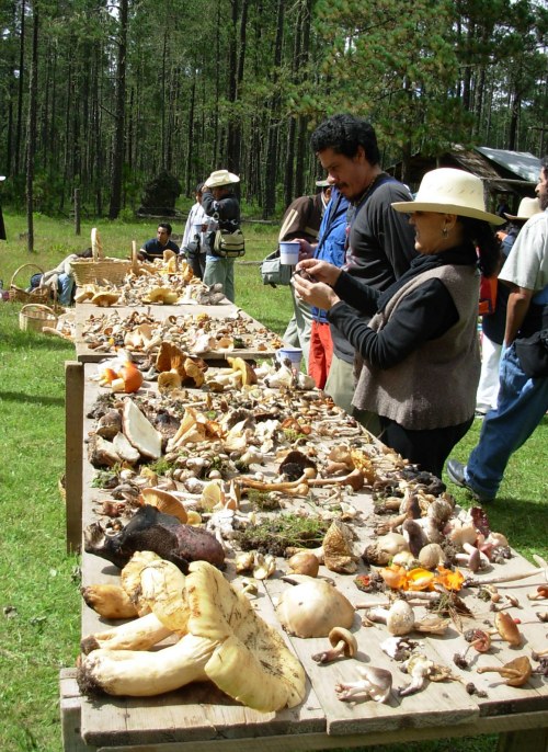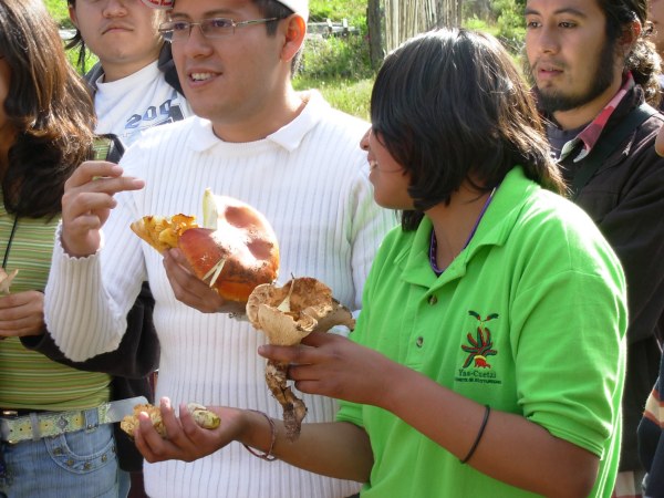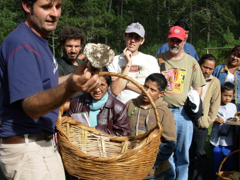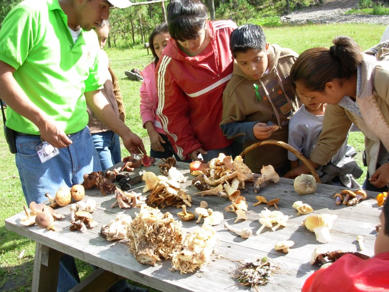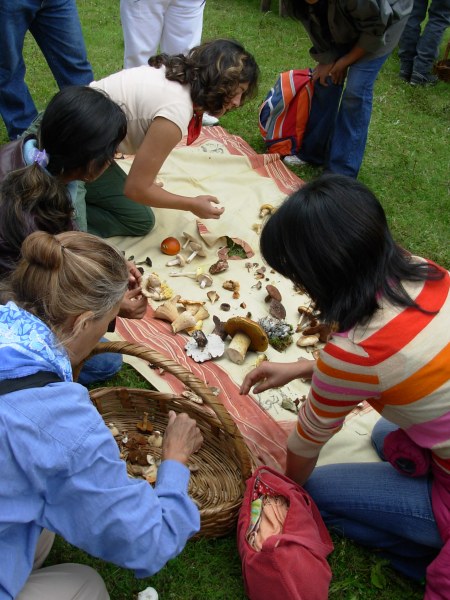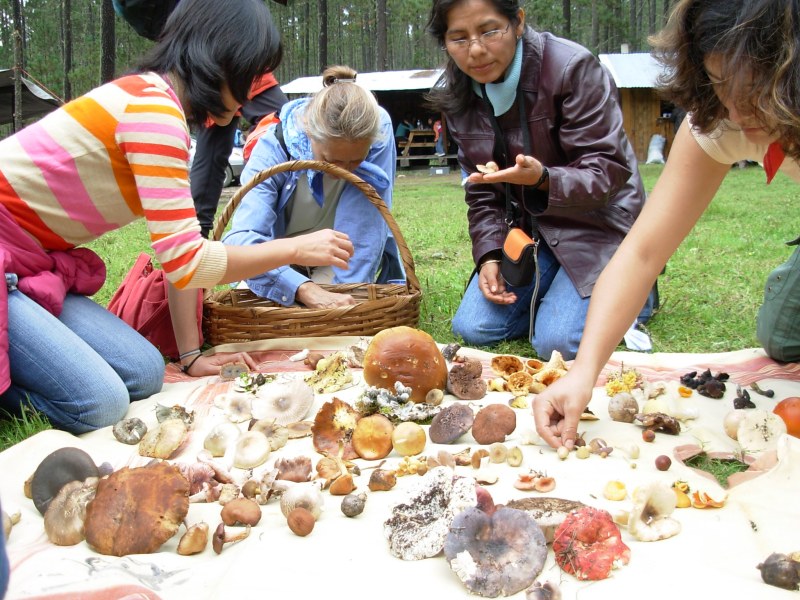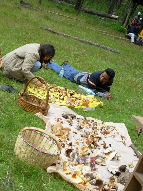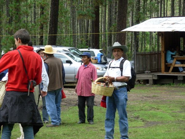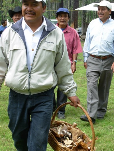 Each group returns to Cuajimoloyas with their basket of mushrooms. Experts sort and judge the returns.