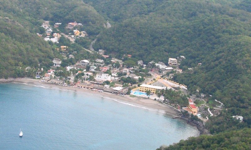 ![]() | Cuastecomates is a small community tucked into a small, secluded bay located about a mile west of Melaque. It features a 300-yard long beach with gentle waves. There are a number of palapa restaurants along the beach and one very fine (at one time at least) hotel at the south end. This is the only hotel in town as far as I know. Snorkeling is possible at the south end near the hotel. The bay is a good diving location. |