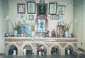 ![]() Altars are common in Oaxacan houses. They can serve various purposes. Some are places of (usually Catholic) prayer; some are specially erected for holidays such as Days of The Dead; some are erected to assist in the preparation of potions, poultices and materials used to "clean" bodies of afflictions. This one belongs to a weaving family in Teotitlan del Valle, outside Oaxaca city. [Photo by Diana Ricci] |