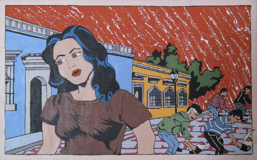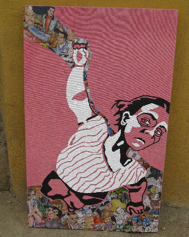 Roy Fox Lichtenstein [1923 - 1997] was a prominent American pop artist, whose work was heavily influenced by both popular advertising and the comic book style. The latter clearly shines through in Dunnett's more recent works, and in an earlier piece which graces a wall in her home in Oaxaca's Xochimilco neighborhood which she shares with her boyfriend and three others: "That one's based on a dream I had, certainly with overt comic book imagery; in the particular dream there was a calenda (parade), with bodies being dragged through the streets. I once did a series based on my dreams. I dyed the red sky forming part of the background of this canvas with cochineal [the minute insect with naturally produces carminic acid, and was an important export industry for Oaxaca during colonial times]."