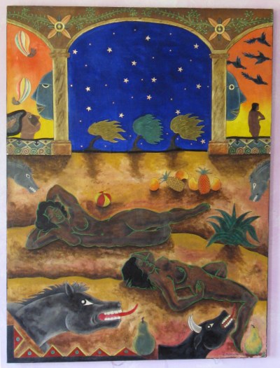 “Sure Morales was my primary mentor over the years,” Flores readily acknowledges, “but his work has provided a significant stimulus for well over half of the artists in Oaxaca. However if you examine my work carefully, it should become apparent that I’m a student of a number of the impressionists, in particular Monet and Gauguin. I consider them to be very strong influences in my work; just look at my use of color.” But ask Flores for a single name, and enigmatic Flemish painter Hieronymus (Geronimo) Bosch (c. 1450 – 1516) immediately rolls off his tongue. Enrique’s extraordinary melding of influences then becomes apparent.
