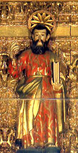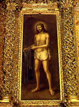 Although the centerpiece of the retablo is a wooden statue of the patron Saint Andrew, a striking polychrome figure notable for its powerful bearded visage, the retablo principally showcases a group of three unusual canvases depicting episodes from Christ's Passion.