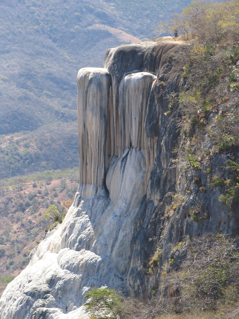 Hierve el Agua (the Water Boils) is a state park located 80km/48mi (about 2 hours) southeast of Oaxaca City.There is a collection of pools at the site fed by mineral springs that flow at about 2 liters/second. Two waterfalls with beautiful calcium deposits drop over cliffs in the Sierra Madres at an altitude of 5800'. Access is by unpaved mountain roads. From Oaxaca City, travel east on hwy 190 for 45 kilometers, continue 27 kilometers on hwy 179, then fork right and continue 6 kilometers. The springs were used in a Zapotec irrigation system dating back to around 1300 B.C. The water has a high calcium carbonate and magnesium content that has resulted in the heavy deposits seen in the photo at right. The water bubbles with escaping air giving the appearance that it is boiling. It is actually a warm spring with a temperature in the 71-77°F range. You can go for a swim in the pools. There are cabins at the site for overnight stays and a few small restaurants. A nearby mezcal distillery may be visited. Local crafts include items made from palm leaves. A trail leads down to the base of the feature shown at right and takes 40 minutes to an hour to hike. The site has experienced some openings and closings due to local disputes over entrance fees among the communities of San Bartolo, San Isidro Roagui, and San Lorenzo Albarradas. The fee is usually 20 pesos. If traveling from Oaxaca City, some places of interest along the way include El Tule and the small archaeological sites of Dainzú, Lambityeco, and Yagul. The route passes through a mezcal-producing region. |