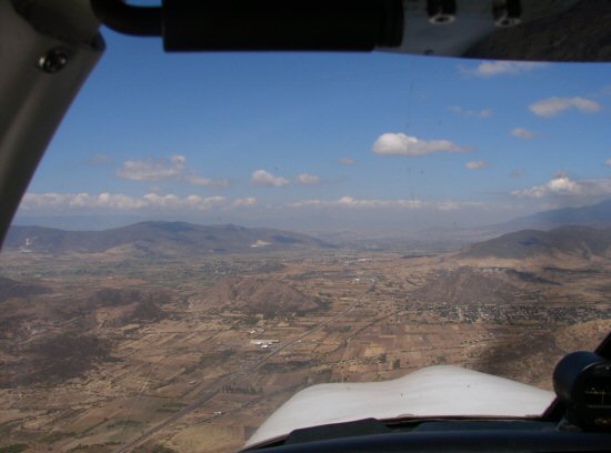 After several exchanges in English with the air traffic controller, we were Hierve el Agua bound. I must admit that for me the somewhat wobbly ascent was a bit uncomfortable. I sat beside Tom, feeling a bit like a co-pilot, with my own steering wheel and foot pedals. Soon enough we were at cruising altitude, Tom and I communicating with our headsets and attached microphones in place, while Doris sat in back, quietly. As we ascended to cruising altitude, Tom began taking photos, or perhaps he was using the video mode. I didn't ask. Tom would frequently use his camera throughout our flight.