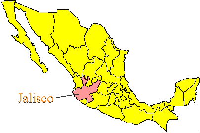 | The state of Jalisco covers an area of 30,910 square miles and is a leading producer of maize, beans, and livestock. Guadalajara, the capital city, is located in the center of the state and most of the population is in the central and northeastern regions. In other parts of the state, the terrain is more rugged. The active volcano, Volcán de Fuego, is in the southern part of the state near the northern border of the state of Colima. |   |