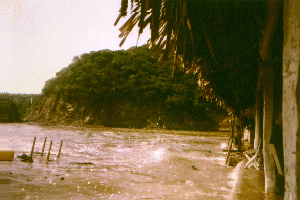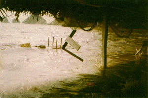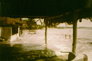 On October 9, 1995, a magnitude 8.0* earthquake centered 19.055°N 104.205°W (15 km east of Manzanillo) at a depth of 33 km caused extensive damage. The quake was one of the strongest of the century. One witness who was in a palm grove reported seeing an earthen wave 4' in height cross the grove. The seas receeded from the bays and then returned as a 25' wave. These photos were taken by Nando Kosonoy of the Terraza Kosonoy as the seas rushed onto the Melaque beach. The Terraza Kosonoy is the beachfront palapa shown in the photos. *This data is from the USGS. Various agencies report somewhat different magnitudes. |