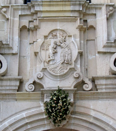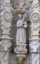 Projecting above the entry in an eared, oval frame, is a relief of the Baptism of Christ (right), a simplified version of the relief on the Rayas Temple, that pushes up into the next level, forming a sill for the moorish choir window overhead. Slender single estípites, carved with the escutcheons of the Franciscan order and trailing prominent strapwork scrolls, extend on each side of the window up into the gable where they are topped by elaborate tiered pinnacles. The pinnacles flank an ornamental niche housing a statue of La Purísima, The Virgin of the Immaculate Conception - an image especially favored by the Franciscans.