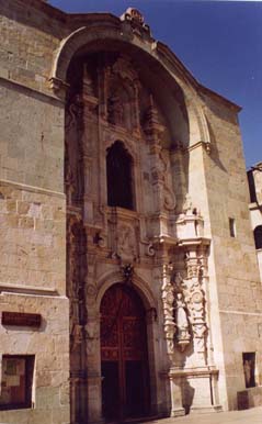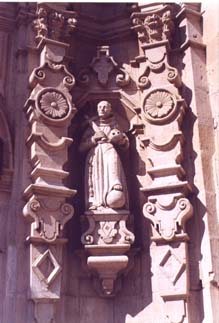 Paired estipites in the lower facade pile bold geometric and prismatic forms one atop another, including such favorite Ureña motifs as diamonds, winged circles and scrolled lambrequins. The latter also bracket the statues of St Francis (left) and San Pedro de Alcántara (right) in the interestípites.