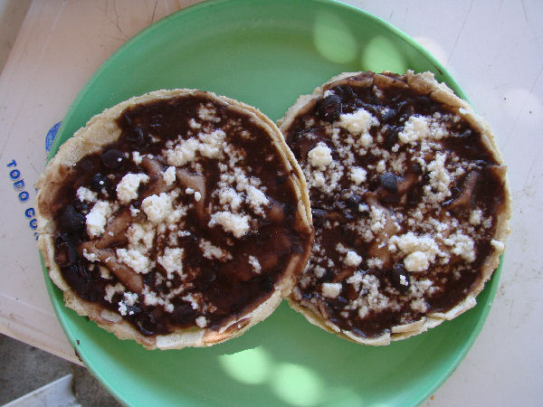![]() Sopes – a delicious restaurant snack of black beans, cheese, and salsa cooked on hand-made tortillas |