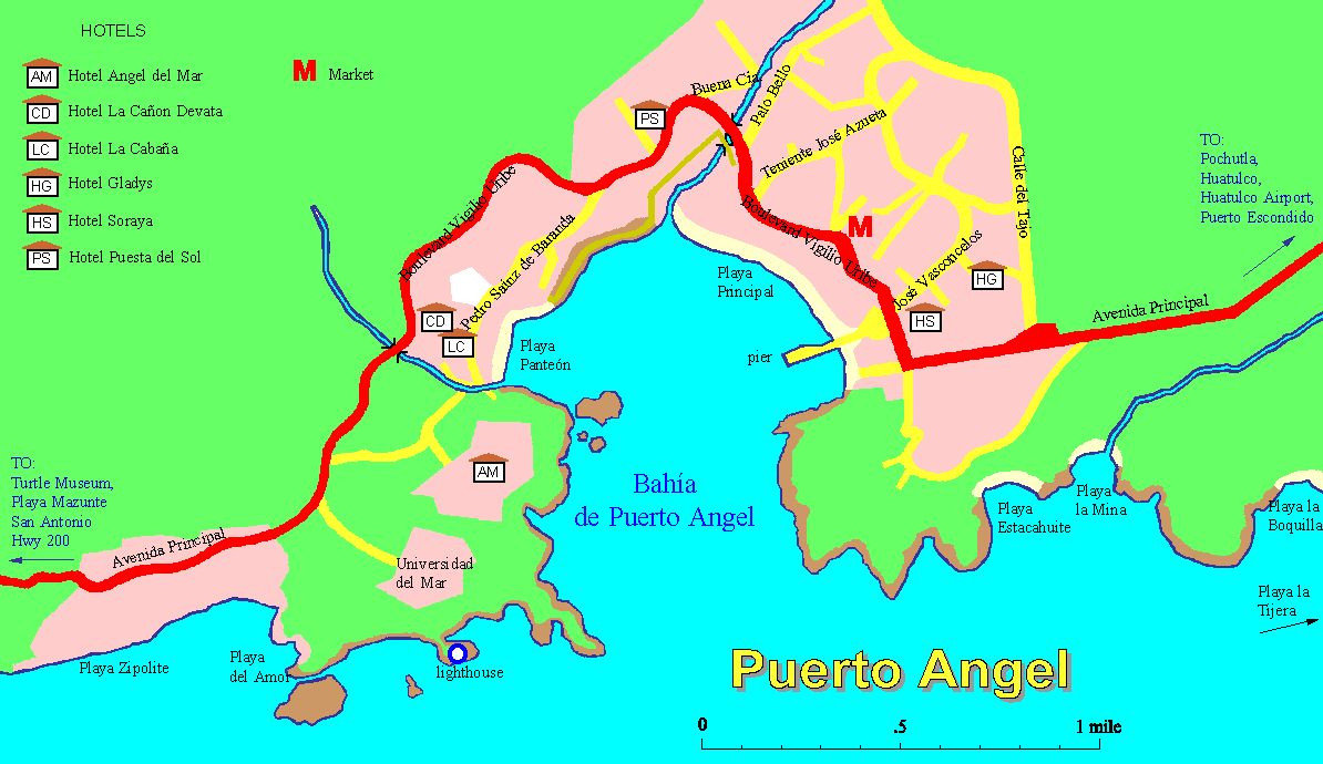 I should mention that you probably won't see the names of these streets elsewhere. There are no street signs in Puerto Angel. The dark brown portion of the coastline is steep and rocky, with the beaches indicated by light tan.