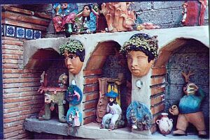 A small part of the interior courtyard wall at the taller (workshop) of the family of Luís Valencia, in San Antonino, Ocotlán, Oaxaca. Luis and his sons work in barro (clay), papier maché, oil/canvas, water colors, and anything else you might have in mind. We have the good fortune to have one of Luis' woodblock engravings, and a ceramic bas relief by eldest son Jorge. Luis is about to mount a show of paper mache animals that will be touring the world. If you get the chance, don't miss it.