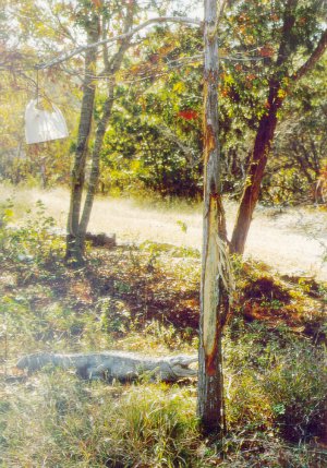 The 'gator didn't do it. Stripling-Blake Co. delivered the rest of the windows and couldn't figure out how to turn their trailer around so ran over this 15' cypress tree and concrete alligator.