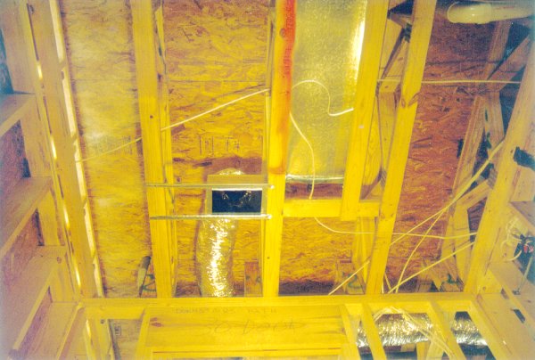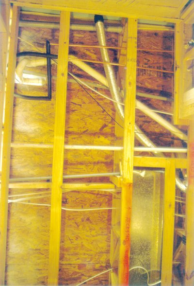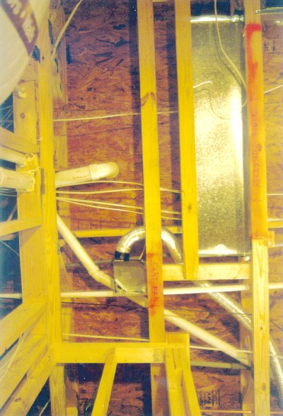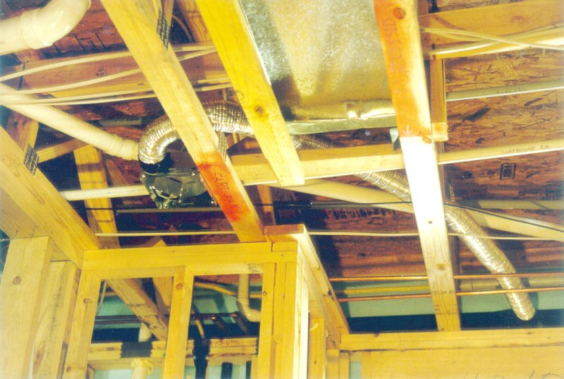 |   | Fart fan duct exits rear wall at top. Tub drain for upstairs bath is at upper left. |