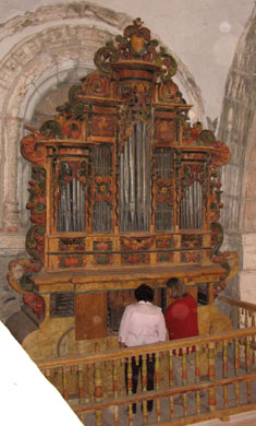 From Yanhuitlan it was a short ride along a country road to Santa Maria Tiltepec, an extraordinary church with a sculpted façade facing across a valley from its hilltop site. Once inside the church we all ascended to the raised choir by a winding stairway to view its 18th century pipe organ, standing like that of Yanhuitlan on its own broad pillar beside the choir. Although not yet ready to be played, the organ was resplendant with intricately carved baroque decoration, each of its large pipes painted with masklike faces.