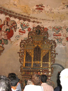 Early Wednesday morning, a smaller group of us, hosted by Cicely Winter and including Maestro Tagliavini gathered for an excursion to visit some of the pipe organs in outlying churches north of the city, in the Mixteca Alta region. Our first stop was at the village of Yucucui, where we were welcomed by a committee of local officials eager to show us their colonial church organ, currently awaiting restoration. The old church is ornamented with painted friezes, colonial carvings and several gilded altarpieces also from colonial times.