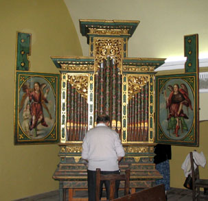 After lunch at a roadside restaurant, we headed back towards Oaxaca city for our last event, a visit to San Andrés Zautla, a small village close to the new Puebla-Oaxaca toll road. The little church here is home to the most beautiful smaller organ that I saw during the festival. Below a carved and gilded crest, ornamental doors painted with archangels open to reveal the by now familiar keyboard, stops and painted pipes. With members of the group energetically pumping the bellows behind the organ - no electronic power here! - Maestro Tagliavini again treated us to a mini concert, obviously delighted with the playing qualities as well as the beauty of this exquisite 1726 instrument. As the villagers prepared the church and its saints for the upcoming Easter celebrations, we reluctantly took our leave and returned to Oaxaca with the sights and especially the sounds of the day still reverberating in our ears and hearts.