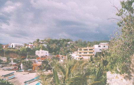 ![]() Afternoon clouds build from the mountains behind Puerto Angel during the rainy season. Playa Principal is in the foregound, Hotel Soraya at right. |
